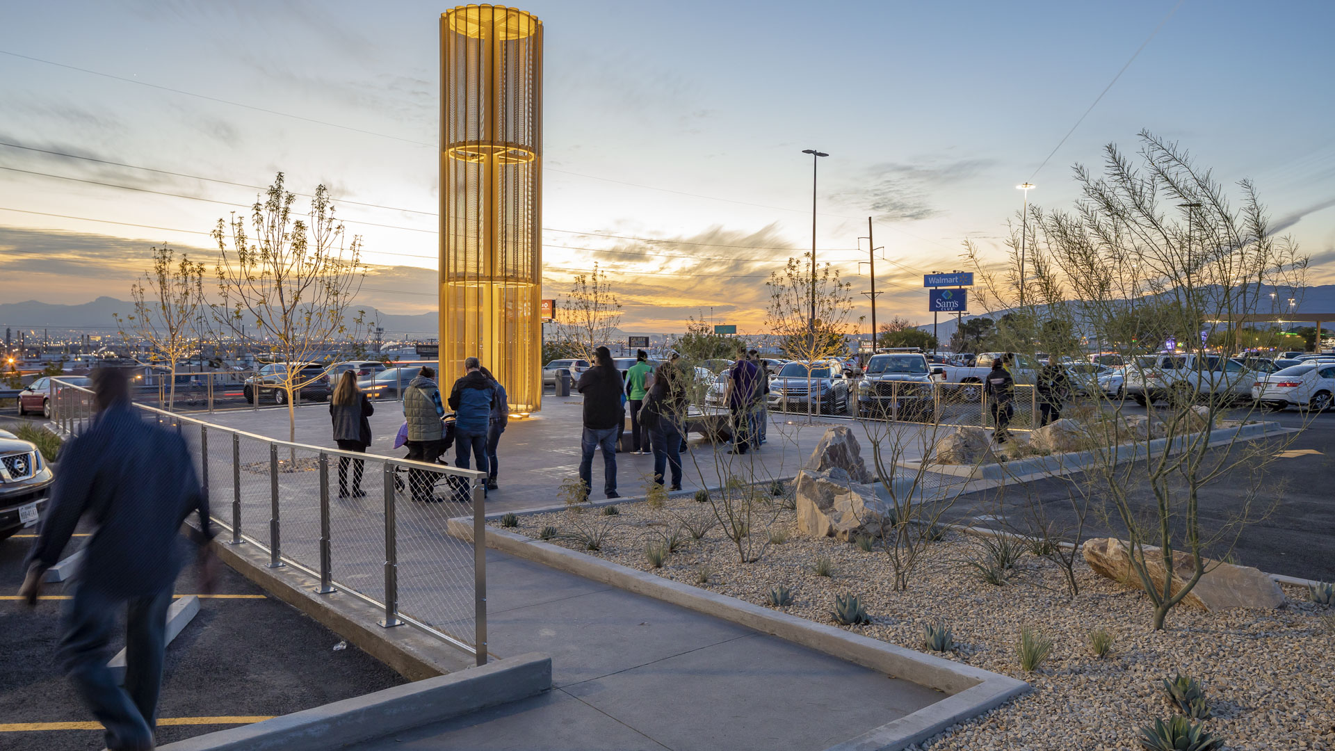 The “Grand Candela” commemorates the victims and survivors of the August 2019 mass shooting tragedy at Walmart’s Cielo Vista store. Inspired by the motif of an everlasting candle and set in a plaza within the store’s parking lot, the memorial offers a dedicated place of healing and remembrance. Columns of perforated metal, one for each life lost, are joined together in a luminous circle of unity that rises thirty feet– high enough to be seen by the impacted community residing on both sides of the border.