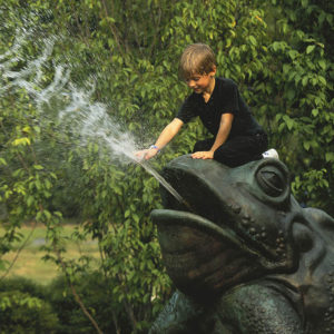 A whimsical space full of energy, The Court of the Giant Toads has been a beloved city landmark since its creation in 1994. As a natural inhabitant of the garden, toads remind their visitors of the complex life cycle of amphibians, once aquatic then a terrestrial creatures. In a design inspired by the element of surprise encountered in many European gardens, visitors approach via a Crape Myrtle allee with a beautiful flagstone walkway through its center, where two solid bluestone basins contain three over-scaled bronze tadpoles, each chasing the tail of the next. These playful teasers introduce a square room of clipped hornbeams, where each of the four Giant Toads spews a 20-foot-long arc of water toward a central orb, delighting frequent visitors and newcomers alike.