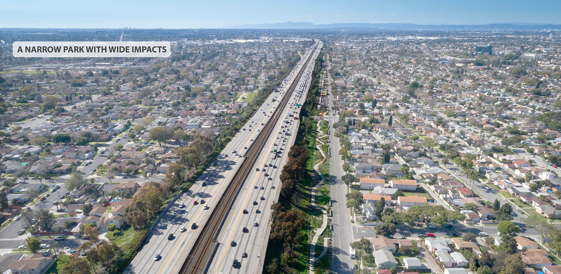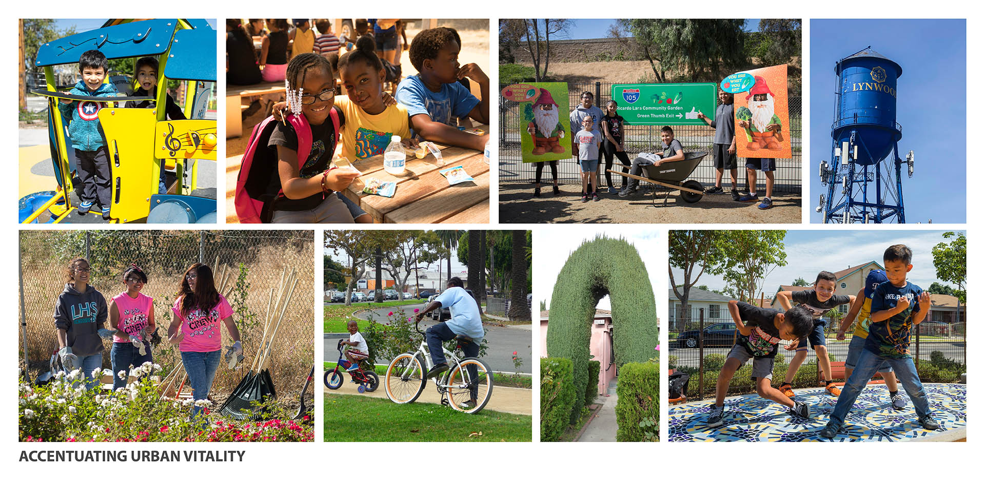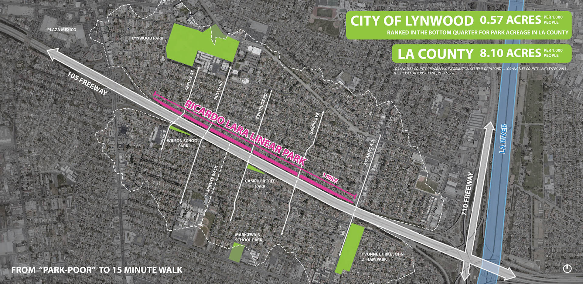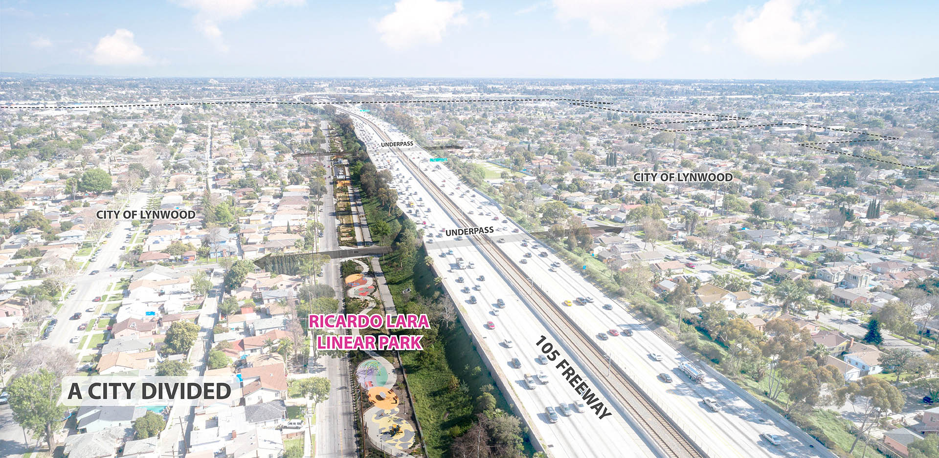Lynwood, California is bisected by a massive freeway corridor, which has burdened the community since its construction. Ricardo Lara Linear Park serves to remedy the negative impacts of the freeway by restoring a sense of community to the City. Lynwood is a diverse community of families, foreign-born residents, and individuals below the federal poverty level. Ricardo Lara Linear Park offers a much-needed amenity-rich destination for this park-poor community. The City of Lynwood suffered from a lack of public, open space for its residents. Ricardo Lara Linear Park serves over 26,000 residents within a half-mile of the park. Ricardo Lara Linear Park replaced five blocks of vacant lots between the freeway and a residential neighborhood. In order to leverage funds backed by California Proposition 84, the community outreach, design, and construction was all completed in under 20 months. Just over a mile in length, the multi-block scheme was envisioned to support the many aspirations of the Lynwood community. Through robust community engagement, the park was programmed with health and connectivity in mind. Ricardo Lara Linear Park offers a continuous path for walking and jogging. The park, which provides a link to a regional bike network along the Los Angeles River, serves as a critical artery for exercise and recreation. Fitness stations that support more intensive exercise programs, along with a series of play structures, a jogging path, and other active programming help facilitate healthy lifestyles. Formerly vacant lots have been planted with climate-adapted grasses, shrubs, and shade trees. Compared to the surrounding context, the park offers 30 percent more shade coverage, making the park a veritable urban oasis. With more than 300 new trees, Ricardo Lara Linear Park has dramatically increased the amount of shade coverage in the neighborhood. The verdant canopy creates a comfortable space for outdoor exercise, play, and relaxation. Census tracts in Lynwood have been identified as “food deserts” by the US Department of Agriculture. One block in the park operates as a community garden, where residents come together and grow thousands of pounds of fresh produce. Ricardo Lara Linear Park is a center for educational programming in Lynwood. The new gathering spaces in the park invite visitors of all ages, and neighborhood schools use the garden to hold community events. Do to the topography of the surrounding site, Ricardo Lara Linear Park encompasses a 24-acre catchment area. Half of the I-105 runoff is filtered by bioswales in the park that eventually recharge the water table. The systems of stormwater direction, detention, and filtration are built into a treatment train in the park. Capturing water through green infrastructure alleviates previous problems with flooding. Along the length of the park, playgrounds, shaded seating, and public artworks all serve to create social spaces for Lynwood. The park was carefully designed to serve the City’s vibrant, multigenerational population. The programs within the park accentuate the urban vitality of Lynwood. Its design draws inspiration from the surrounding neighborhood, reflecting the creativity of its dynamic residents. Ricardo Lara Linear Park creates a vibrant space for the community of Lynwood. While the challenges in this urban context are typical of disadvantaged communities, the park responds to the unique aspirations of the people it serves.