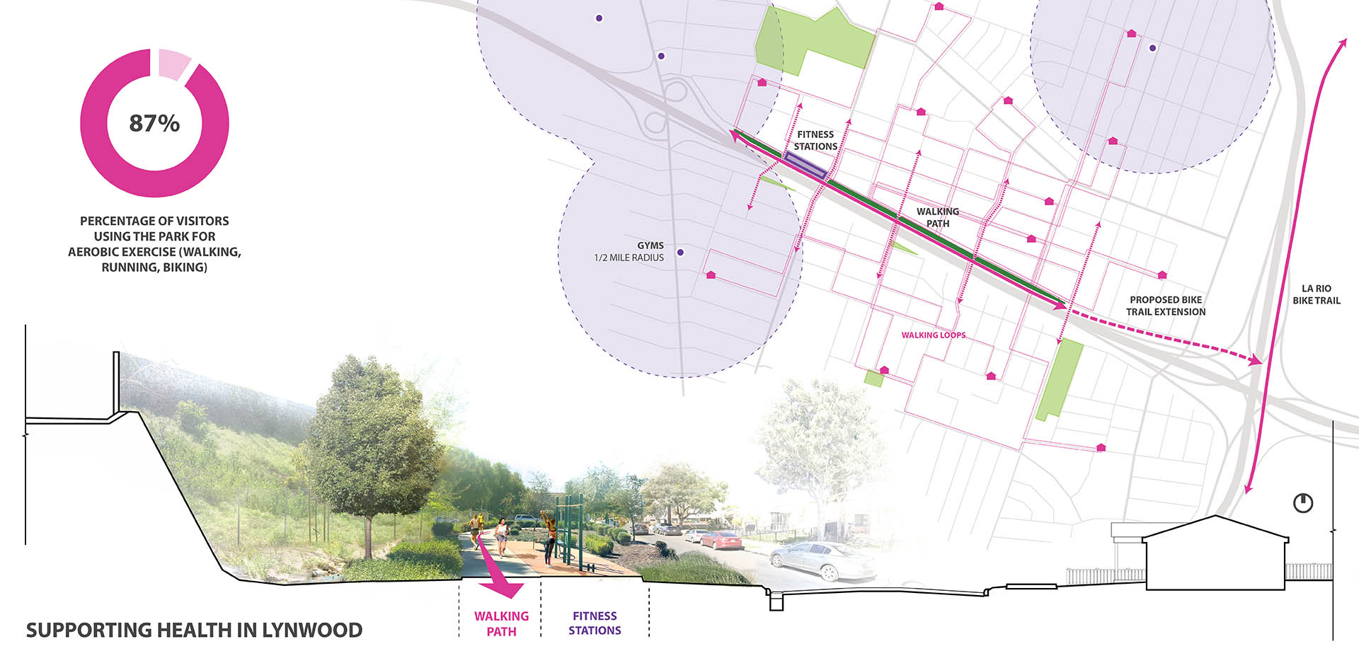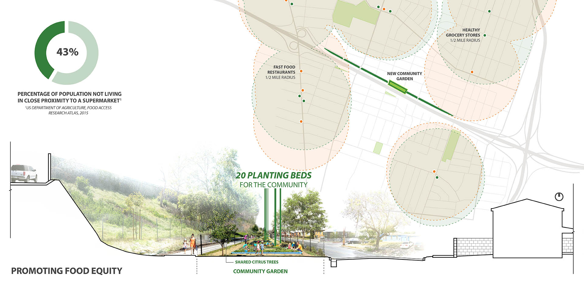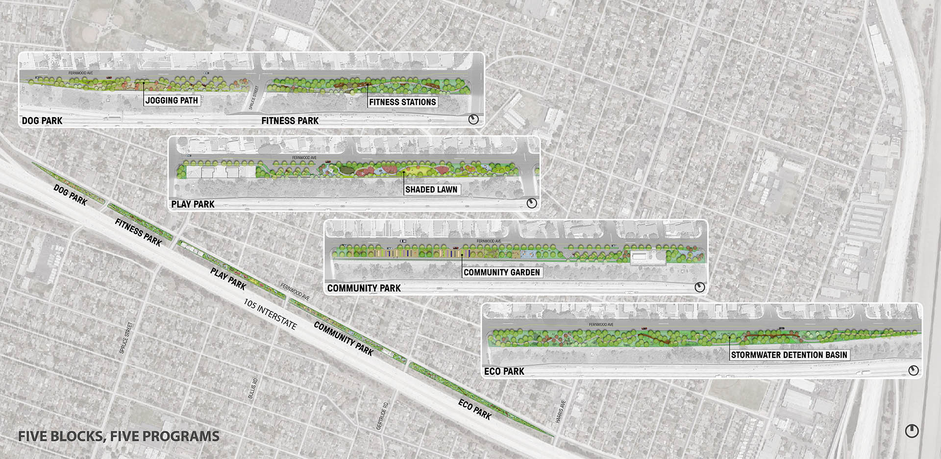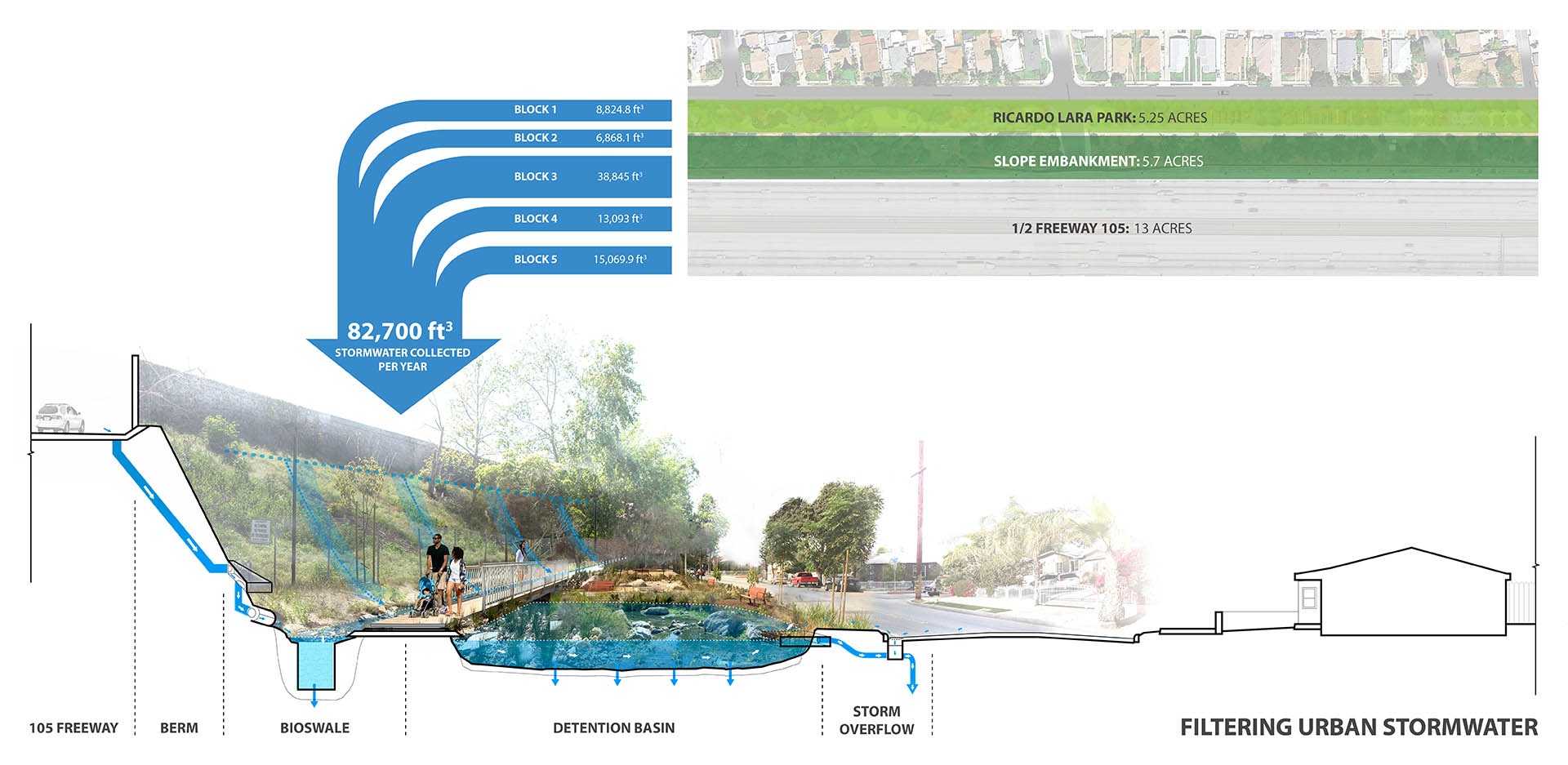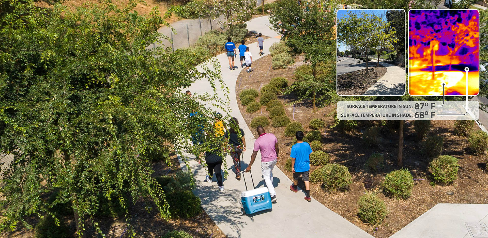 Lynwood, California is bisected by a massive freeway corridor, which has burdened the community since its construction. Ricardo Lara Linear Park serves to remedy the negative impacts of the freeway by restoring a sense of community to the City. Lynwood is a diverse community of families, foreign-born residents, and individuals below the federal poverty level. Ricardo Lara Linear Park offers a much-needed amenity-rich destination for this park-poor community. The City of Lynwood suffered from a lack of public, open space for its residents. Ricardo Lara Linear Park serves over 26,000 residents within a half-mile of the park. Ricardo Lara Linear Park replaced five blocks of vacant lots between the freeway and a residential neighborhood. In order to leverage funds backed by California Proposition 84, the community outreach, design, and construction was all completed in under 20 months. Just over a mile in length, the multi-block scheme was envisioned to support the many aspirations of the Lynwood community. Through robust community engagement, the park was programmed with health and connectivity in mind. Ricardo Lara Linear Park offers a continuous path for walking and jogging. The park, which provides a link to a regional bike network along the Los Angeles River, serves as a critical artery for exercise and recreation. Fitness stations that support more intensive exercise programs, along with a series of play structures, a jogging path, and other active programming help facilitate healthy lifestyles. Formerly vacant lots have been planted with climate-adapted grasses, shrubs, and shade trees. Compared to the surrounding context, the park offers 30 percent more shade coverage, making the park a veritable urban oasis. With more than 300 new trees, Ricardo Lara Linear Park has dramatically increased the amount of shade coverage in the neighborhood. The verdant canopy creates a comfortable space for outdoor exercise, play, and relaxation. Census tracts in Lynwood have been identified as “food deserts” by the US Department of Agriculture. One block in the park operates as a community garden, where residents come together and grow thousands of pounds of fresh produce. Ricardo Lara Linear Park is a center for educational programming in Lynwood. The new gathering spaces in the park invite visitors of all ages, and neighborhood schools use the garden to hold community events. Do to the topography of the surrounding site, Ricardo Lara Linear Park encompasses a 24-acre catchment area. Half of the I-105 runoff is filtered by bioswales in the park that eventually recharge the water table. The systems of stormwater direction, detention, and filtration are built into a treatment train in the park. Capturing water through green infrastructure alleviates previous problems with flooding. Along the length of the park, playgrounds, shaded seating, and public artworks all serve to create social spaces for Lynwood. The park was carefully designed to serve the City’s vibrant, multigenerational population. The programs within the park accentuate the urban vitality of Lynwood. Its design draws inspiration from the surrounding neighborhood, reflecting the creativity of its dynamic residents. Ricardo Lara Linear Park creates a vibrant space for the community of Lynwood. While the challenges in this urban context are typical of disadvantaged communities, the park responds to the unique aspirations of the people it serves.