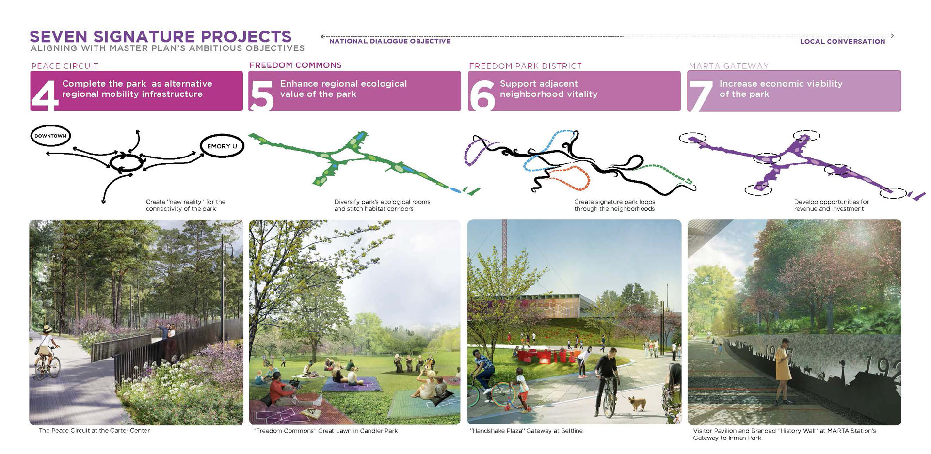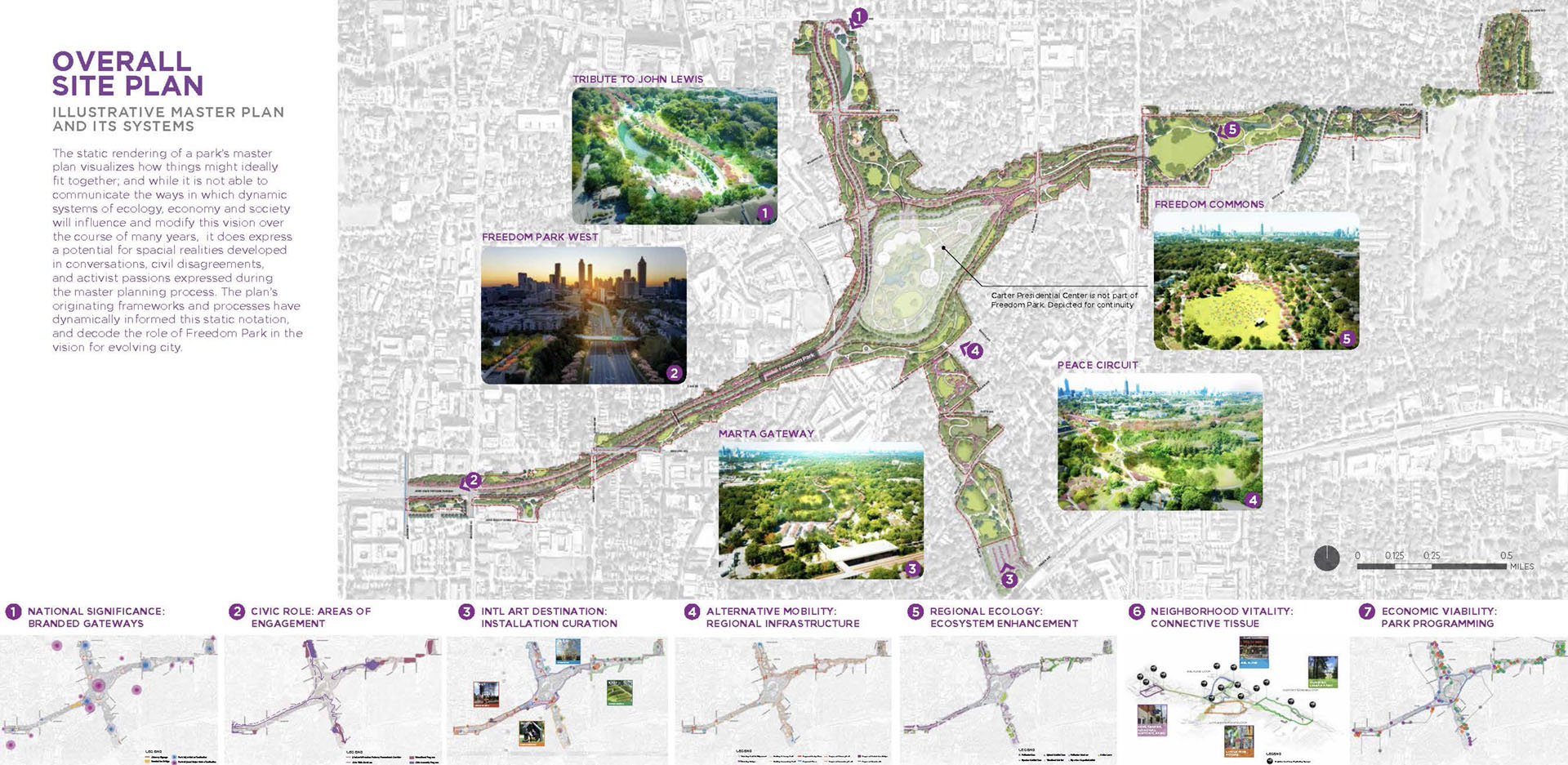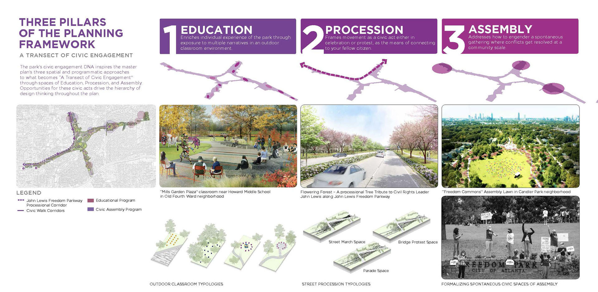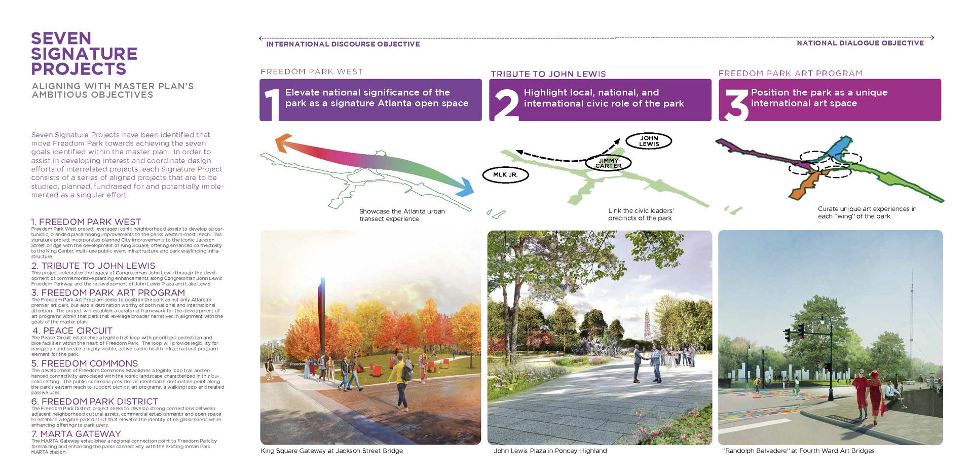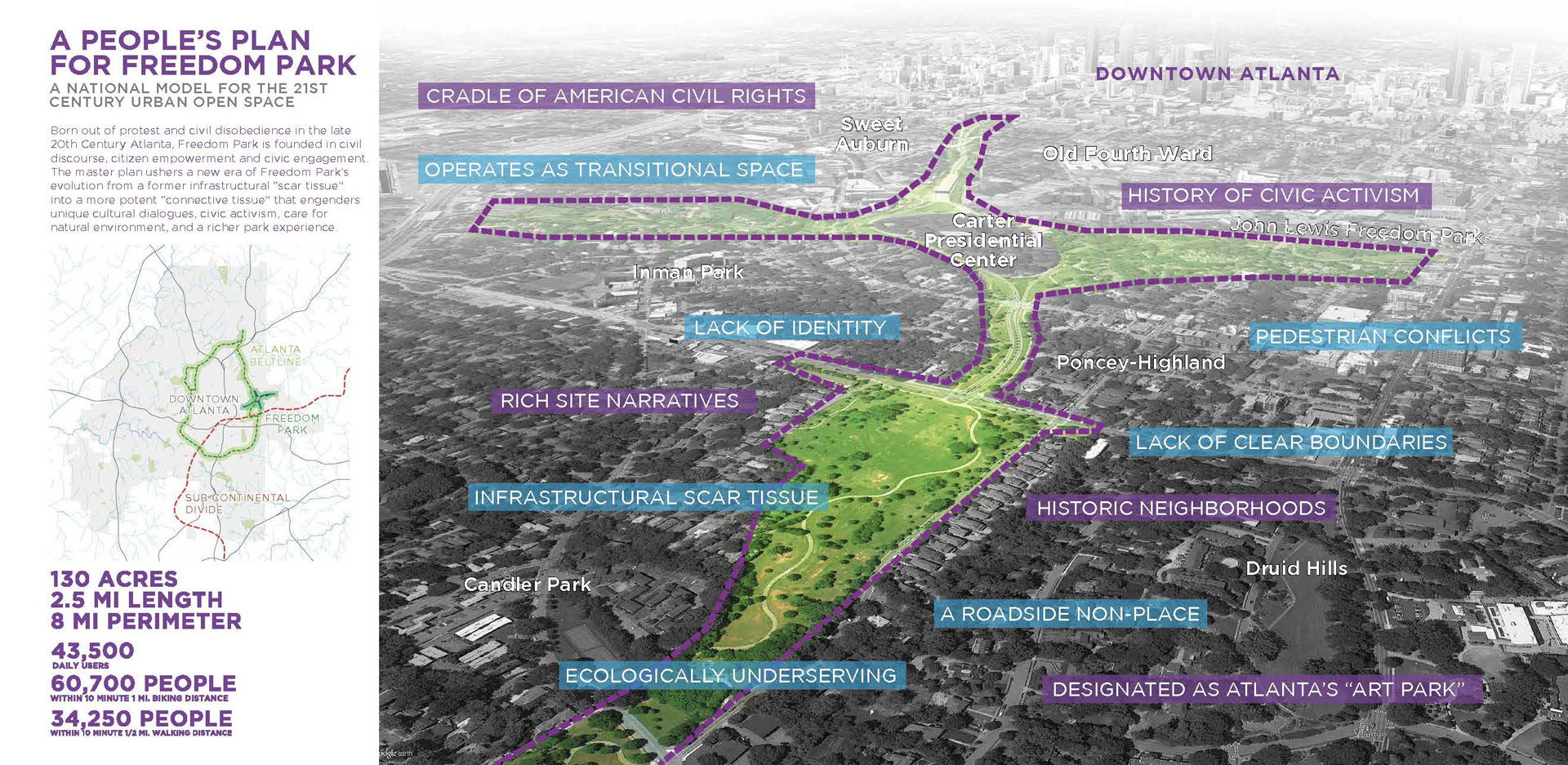 Freedom Park, extending east from downtown Atlanta, bears the scar of land cleared through seven neighborhoods for the development of a proposed highway. Today, the park provides valuable open space for thousands of residents within a rich cultural context. The park’s history of civic activism and community empowerment began with the efforts of citizen-led protests to halt proposed highway construction. Today, the legacy of those efforts lives on through Freedom Park Conservancy and aligned neighborhood park stewards. Public engagement for the Master Plan resulted in a People’s Plan for park improvements. A robust series of on-line and in-person meetings, presentations, surveys and outreach helped give voice to public priorities and shape proposed master plan projects. Freedom Park occupies a transect of land that touches on a rich history of cultural events, nationally significant historical figures, iconic public infrastructure and natural features. The Master Plan seeks to reveal this urban palimpsest to elevate the park experience. Detailed analysis of the site was grouped into five basic categories for communication with the public to help solicit informed feedback on the project and build towards aspirational improvements that will help to transform the park. The park’s design framework embeds the park’s legacy of civic action into the Master Plan. Three primary criteria — education, procession and assembly — were prioritized to help give shape to and guide the narrative of future improvements. Seven Signature Projects identified: Freedom Commons - establishing public grounds; Tribute to John Lewis – Procession and Assembly spaces focused on civic discourse through the legacy of Congressman Lewis; Freedom Park Art Program – establishing ‘gallery wings’ as part of Atlanta’s Art Park. Peace Circuit – road removal offers healthy infrastructure around the Carter Center; Freedom Park West – focused on ecological restoration and art; Freedom Park District – creating legible loops to highlight neighborhood assets; MARTA Gateway – gateway for visitors and access to transit. The park is developed around a series of design systems focusing on: Branded Gateways, Curation of Public Art, Mobility Infrastructure and Ecosystem Enhancement. The framework established allows for implementation flexibility while maintaining the principles of the plan. Over 70 projects were identified for the Master Plan. Prioritization was developed by evaluation through a series of criteria and consideration of geographic equity. Projects were then grouped into Signature Projects to focus near-term fund raising and design efforts. Lake Lewis, commemorating Congressman John Lewis, envisions an ecological oasis within the heart of the park’s north wing. The lake transforms an underutilized, low-lying lawn into a community space focused on education, reflection and engagement with nature. The MARTA Gateway leverages an existing commuter rail and bus facility to develop a new Gateway into Freedom Park. The plan envisions the establishment of a visitor’s pavilion and Park Timeline Art Wall, offering insights into the park’s history. The rolling topography associated with the west end of the site offers an opportunity to leverage adjacency to Mary Lin Elementary School. The meadow envisions an immersive landscape focused on pollinator habitats and opportunities for engagement with natural systems. At the park’s west end, ‘rooms’ for art installation animate the bucolic natural landscape and offer areas to expand the Park’s existing Art Program. Beneficial habitat landscape enhancements further reinforce the role of this immersive environment. An underutilized street is reimagined as a gateway to the King Center and a cultural event space. The plaza serves as a threshold to the Historic Fourth Ward and home of Dr. Martin Luther King Jr. The spirit of Freedom Park is personified in the legacy of Congressman John Lewis – a place where the public can participate in an open dialogue to find Common Ground and engage in civic discourse for the betterment of our communities.