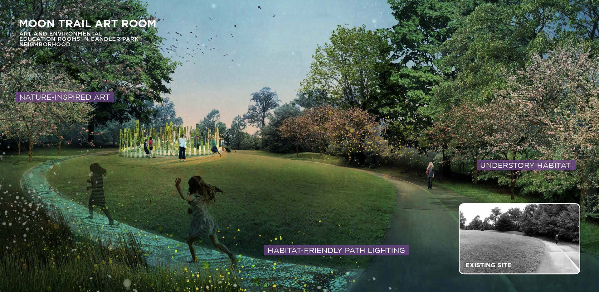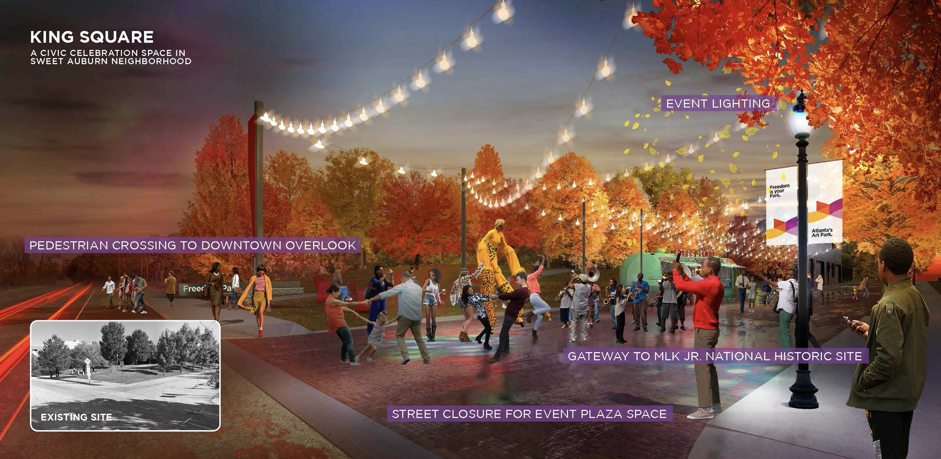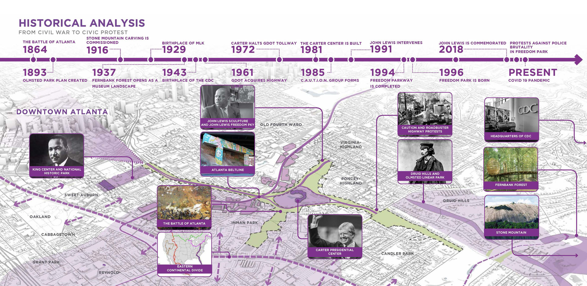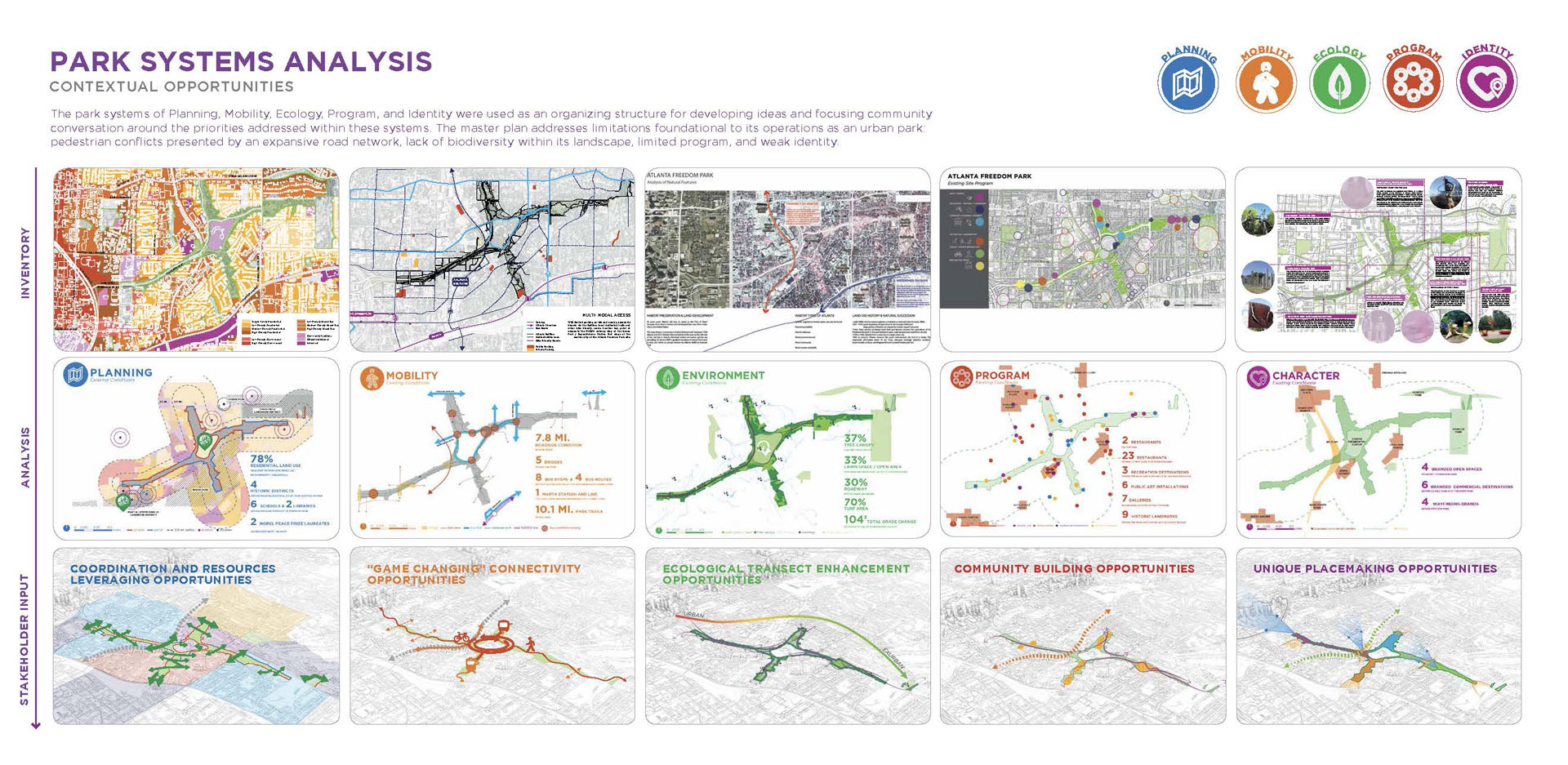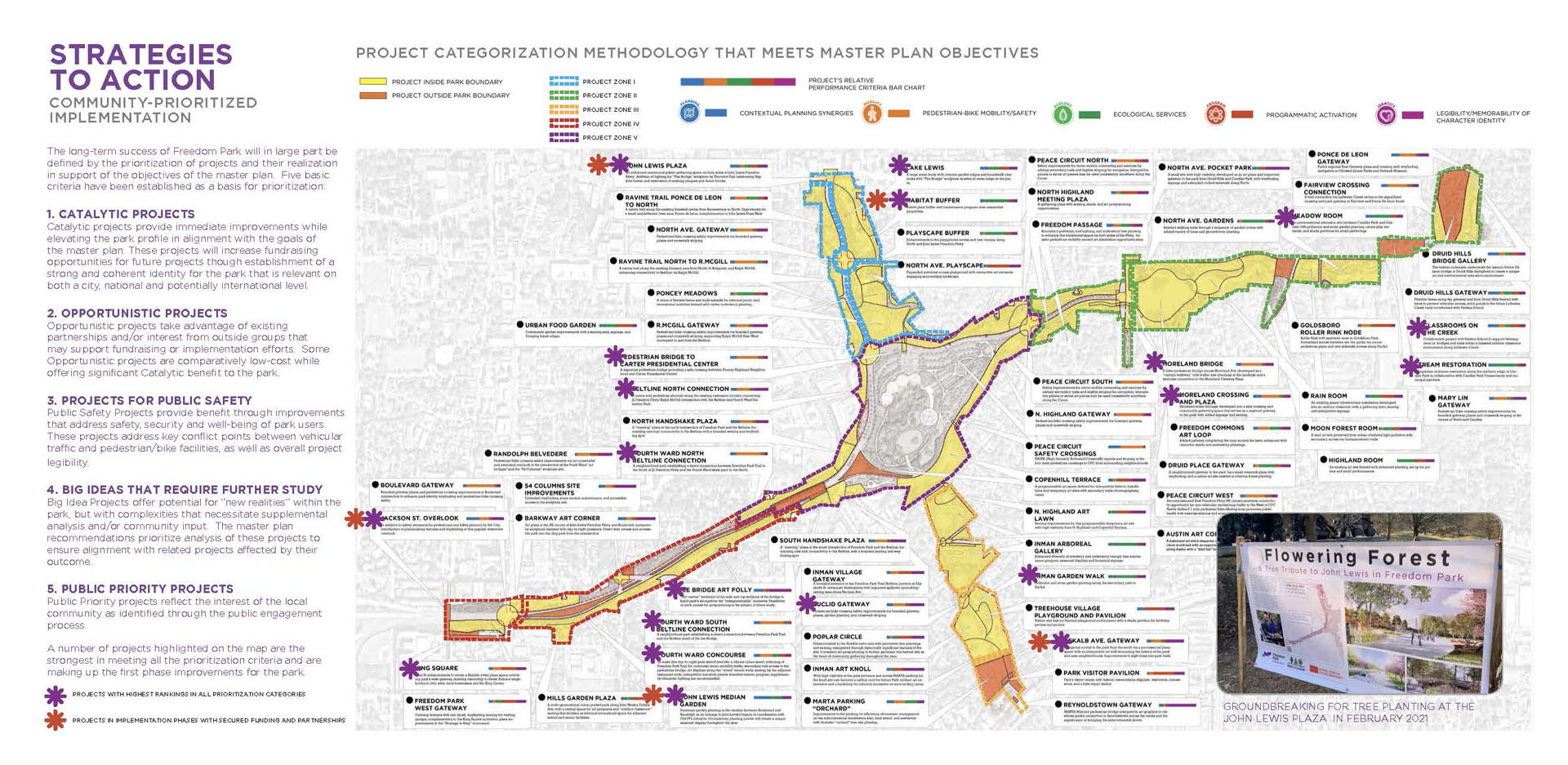 Freedom Park, extending east from downtown Atlanta, bears the scar of land cleared through seven neighborhoods for the development of a proposed highway. Today, the park provides valuable open space for thousands of residents within a rich cultural context. The park’s history of civic activism and community empowerment began with the efforts of citizen-led protests to halt proposed highway construction. Today, the legacy of those efforts lives on through Freedom Park Conservancy and aligned neighborhood park stewards. Public engagement for the Master Plan resulted in a People’s Plan for park improvements. A robust series of on-line and in-person meetings, presentations, surveys and outreach helped give voice to public priorities and shape proposed master plan projects. Freedom Park occupies a transect of land that touches on a rich history of cultural events, nationally significant historical figures, iconic public infrastructure and natural features. The Master Plan seeks to reveal this urban palimpsest to elevate the park experience. Detailed analysis of the site was grouped into five basic categories for communication with the public to help solicit informed feedback on the project and build towards aspirational improvements that will help to transform the park. The park’s design framework embeds the park’s legacy of civic action into the Master Plan. Three primary criteria — education, procession and assembly — were prioritized to help give shape to and guide the narrative of future improvements. Seven Signature Projects identified: Freedom Commons - establishing public grounds; Tribute to John Lewis – Procession and Assembly spaces focused on civic discourse through the legacy of Congressman Lewis; Freedom Park Art Program – establishing ‘gallery wings’ as part of Atlanta’s Art Park. Peace Circuit – road removal offers healthy infrastructure around the Carter Center; Freedom Park West – focused on ecological restoration and art; Freedom Park District – creating legible loops to highlight neighborhood assets; MARTA Gateway – gateway for visitors and access to transit. The park is developed around a series of design systems focusing on: Branded Gateways, Curation of Public Art, Mobility Infrastructure and Ecosystem Enhancement. The framework established allows for implementation flexibility while maintaining the principles of the plan. Over 70 projects were identified for the Master Plan. Prioritization was developed by evaluation through a series of criteria and consideration of geographic equity. Projects were then grouped into Signature Projects to focus near-term fund raising and design efforts. Lake Lewis, commemorating Congressman John Lewis, envisions an ecological oasis within the heart of the park’s north wing. The lake transforms an underutilized, low-lying lawn into a community space focused on education, reflection and engagement with nature. The MARTA Gateway leverages an existing commuter rail and bus facility to develop a new Gateway into Freedom Park. The plan envisions the establishment of a visitor’s pavilion and Park Timeline Art Wall, offering insights into the park’s history. The rolling topography associated with the west end of the site offers an opportunity to leverage adjacency to Mary Lin Elementary School. The meadow envisions an immersive landscape focused on pollinator habitats and opportunities for engagement with natural systems. At the park’s west end, ‘rooms’ for art installation animate the bucolic natural landscape and offer areas to expand the Park’s existing Art Program. Beneficial habitat landscape enhancements further reinforce the role of this immersive environment. An underutilized street is reimagined as a gateway to the King Center and a cultural event space. The plaza serves as a threshold to the Historic Fourth Ward and home of Dr. Martin Luther King Jr. The spirit of Freedom Park is personified in the legacy of Congressman John Lewis – a place where the public can participate in an open dialogue to find Common Ground and engage in civic discourse for the betterment of our communities.
