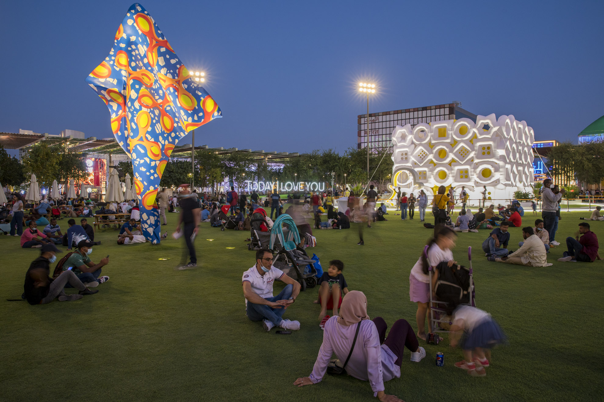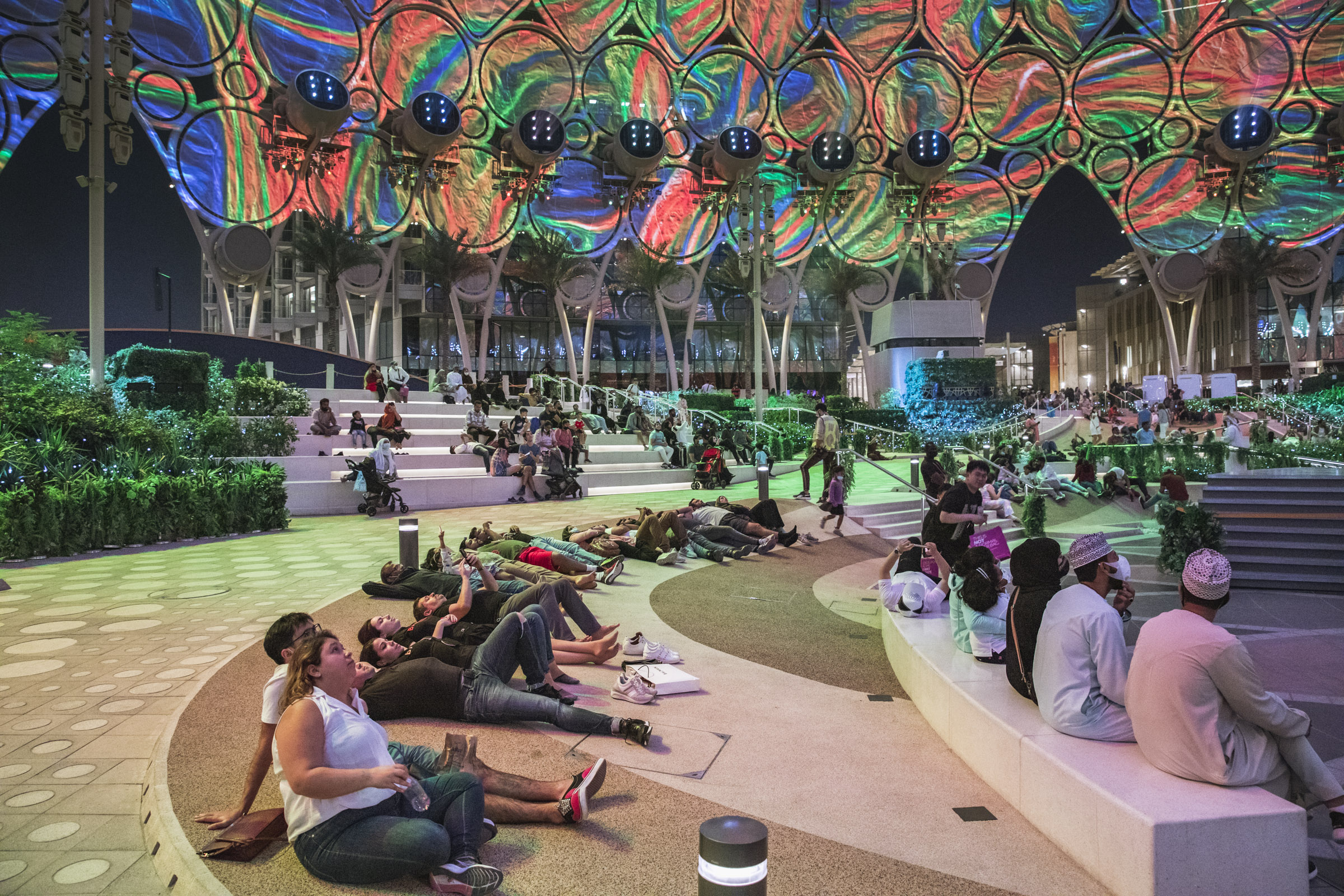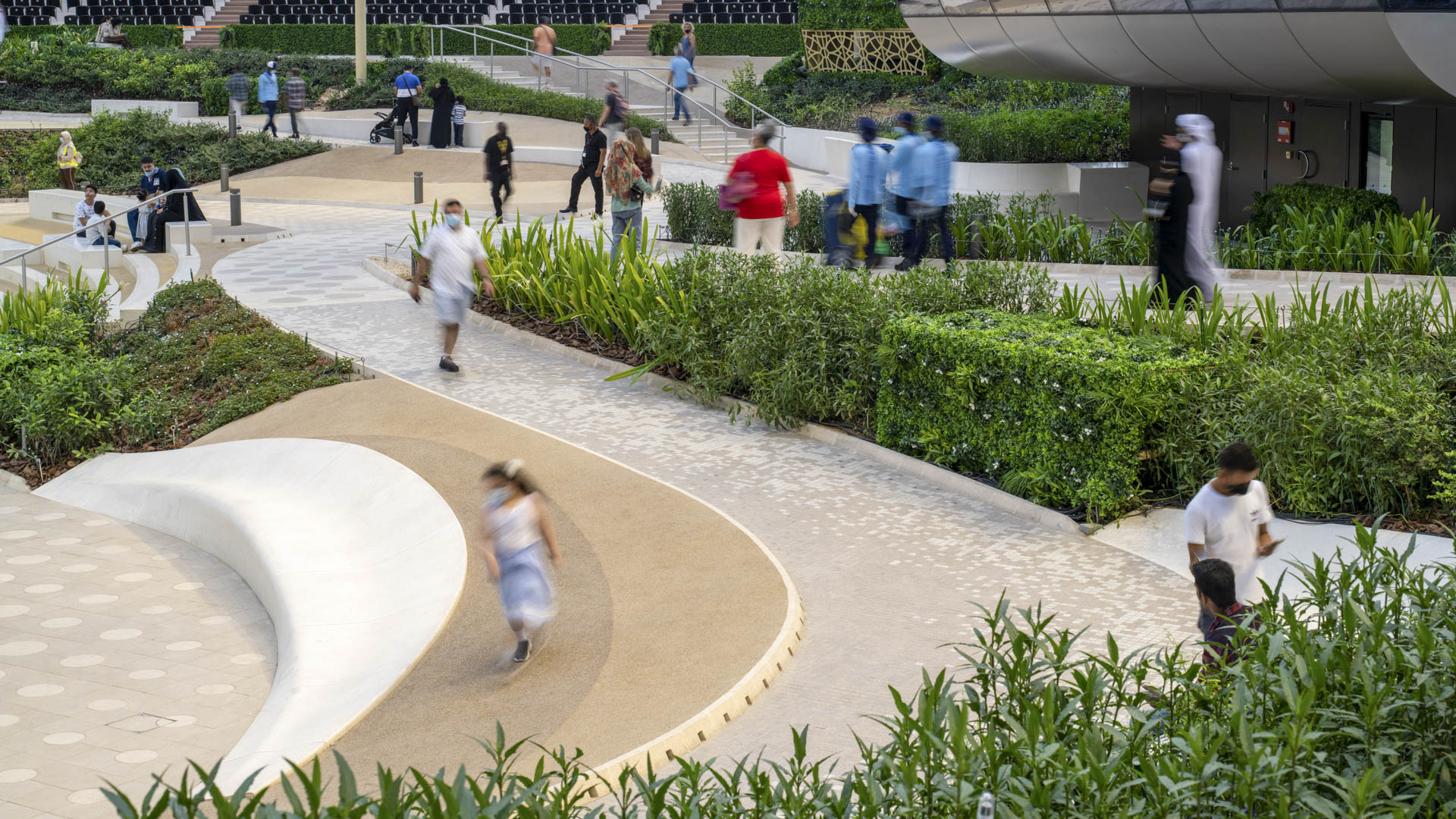 Shown here are scenes from Expo, revealing how the placemaking strategy comfortably accommodates enormous crowds as well as offering moments of private respite.