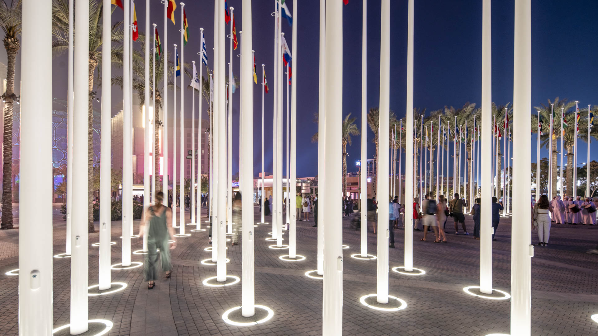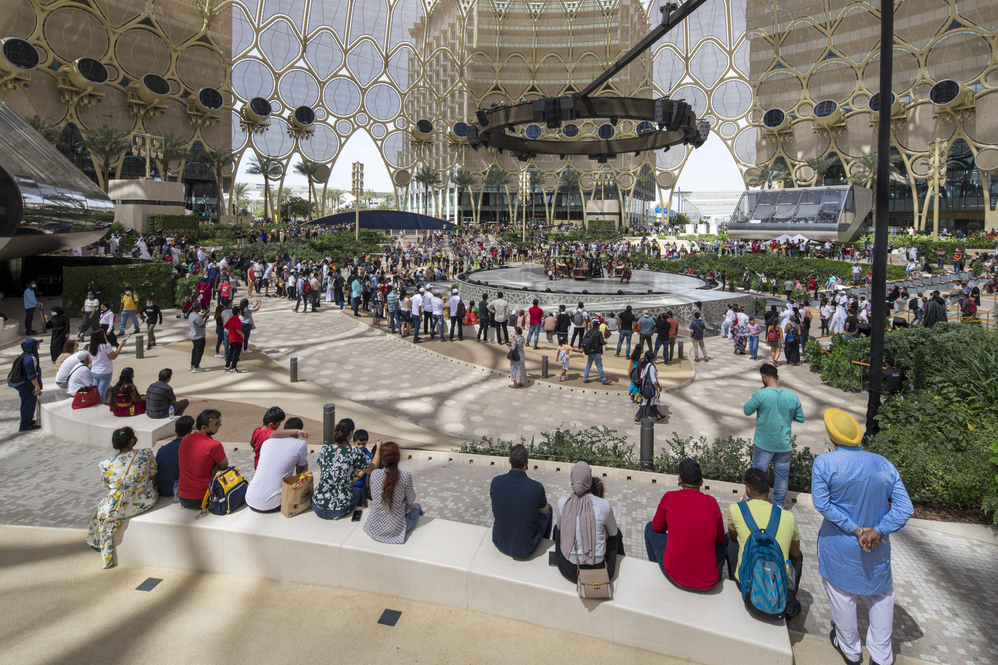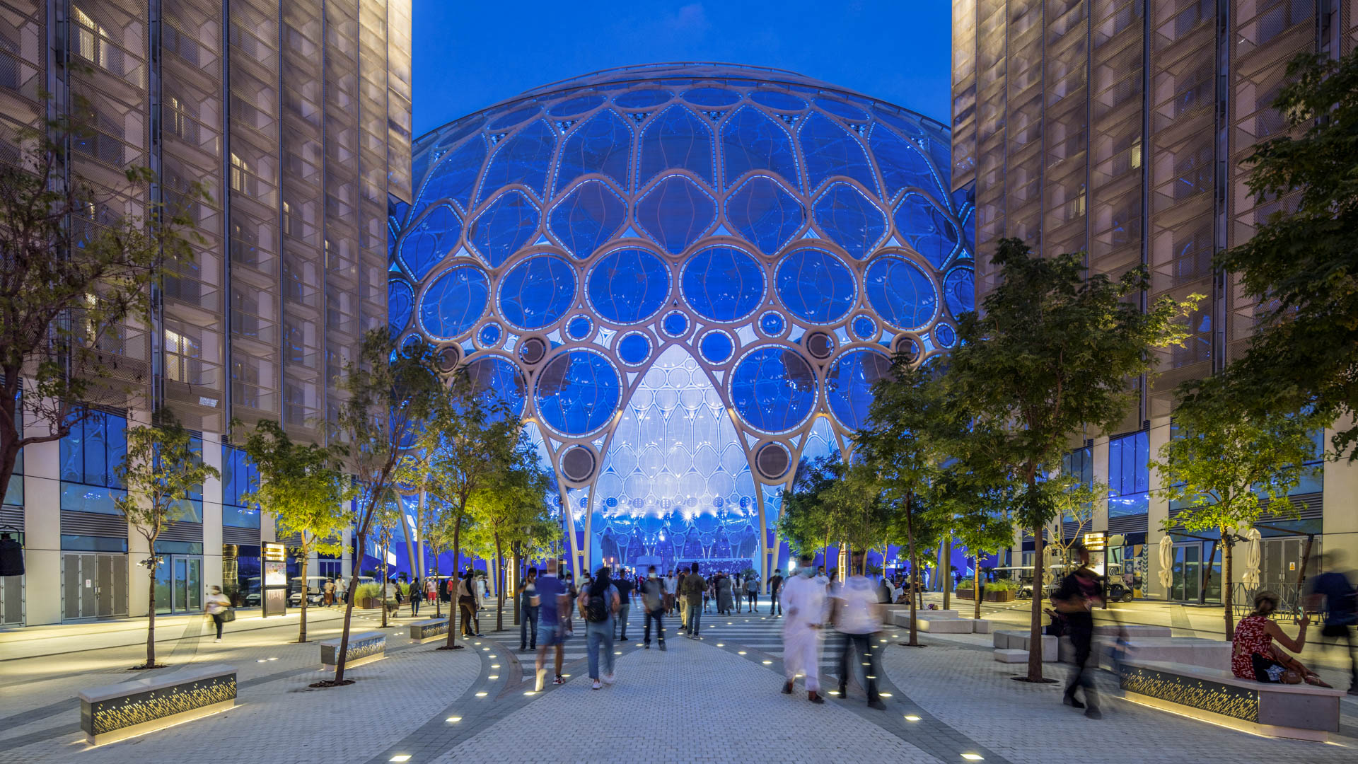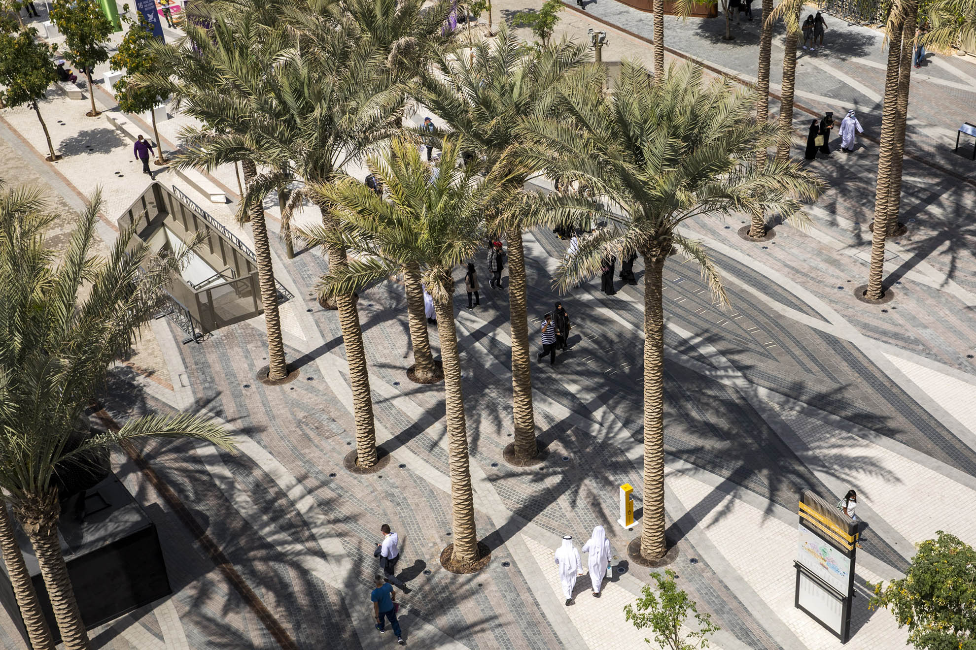 Expo visitors are welcomed with a dramatic progression of experiences upon arrival from the metro station, commencing with a broad Welcome Plaza, which narrows to a central, tree-lined promenade leading to Al Wasl Plaza.