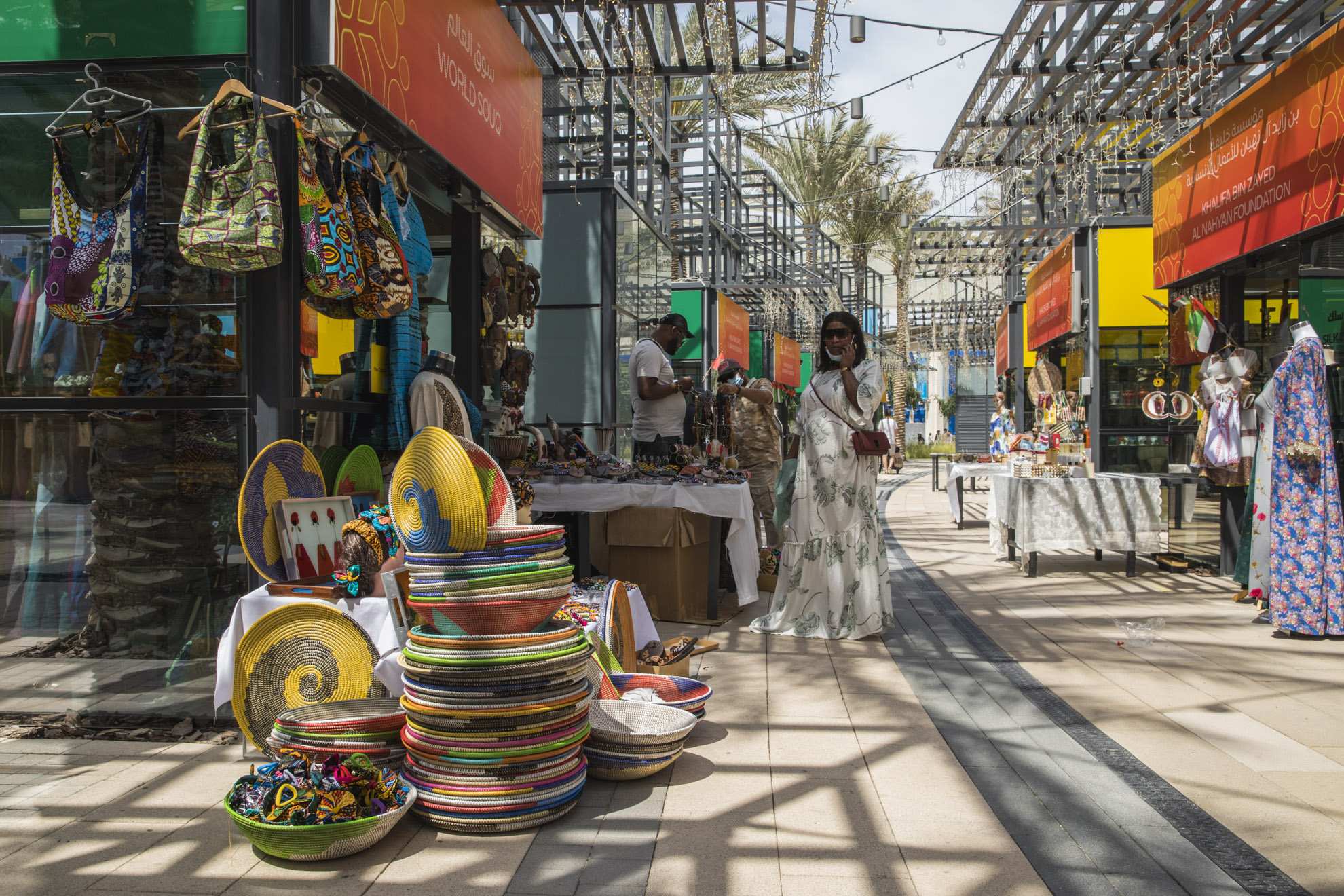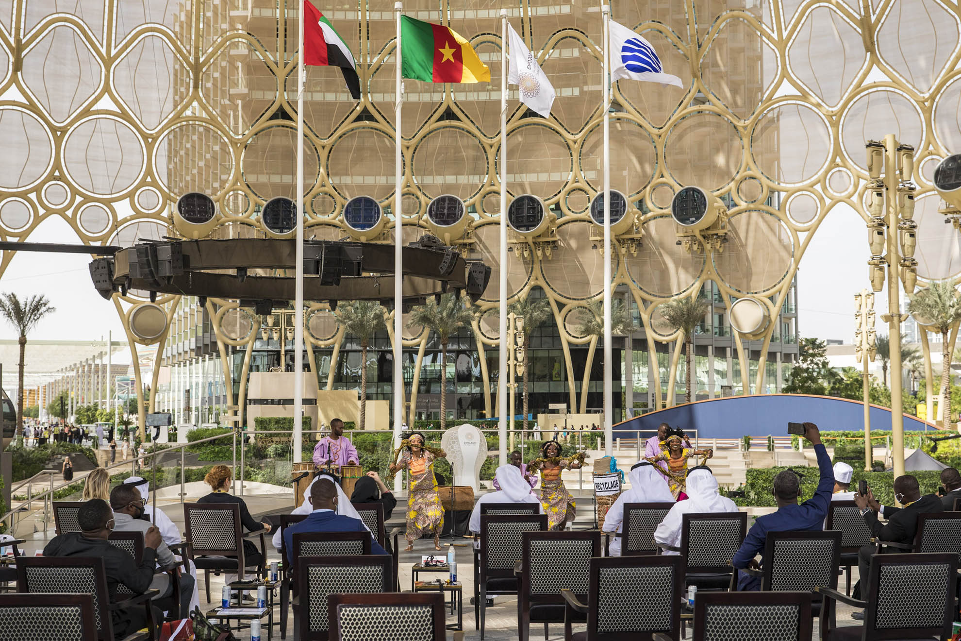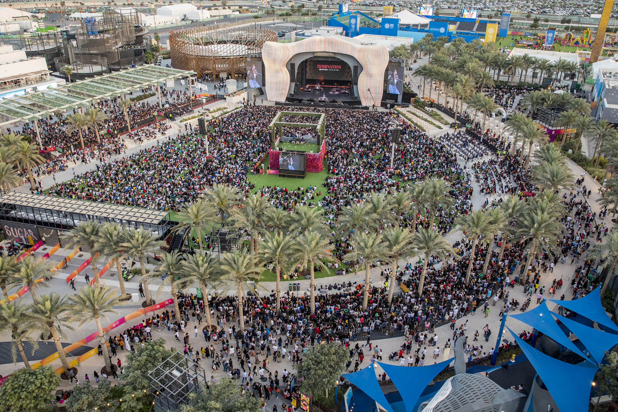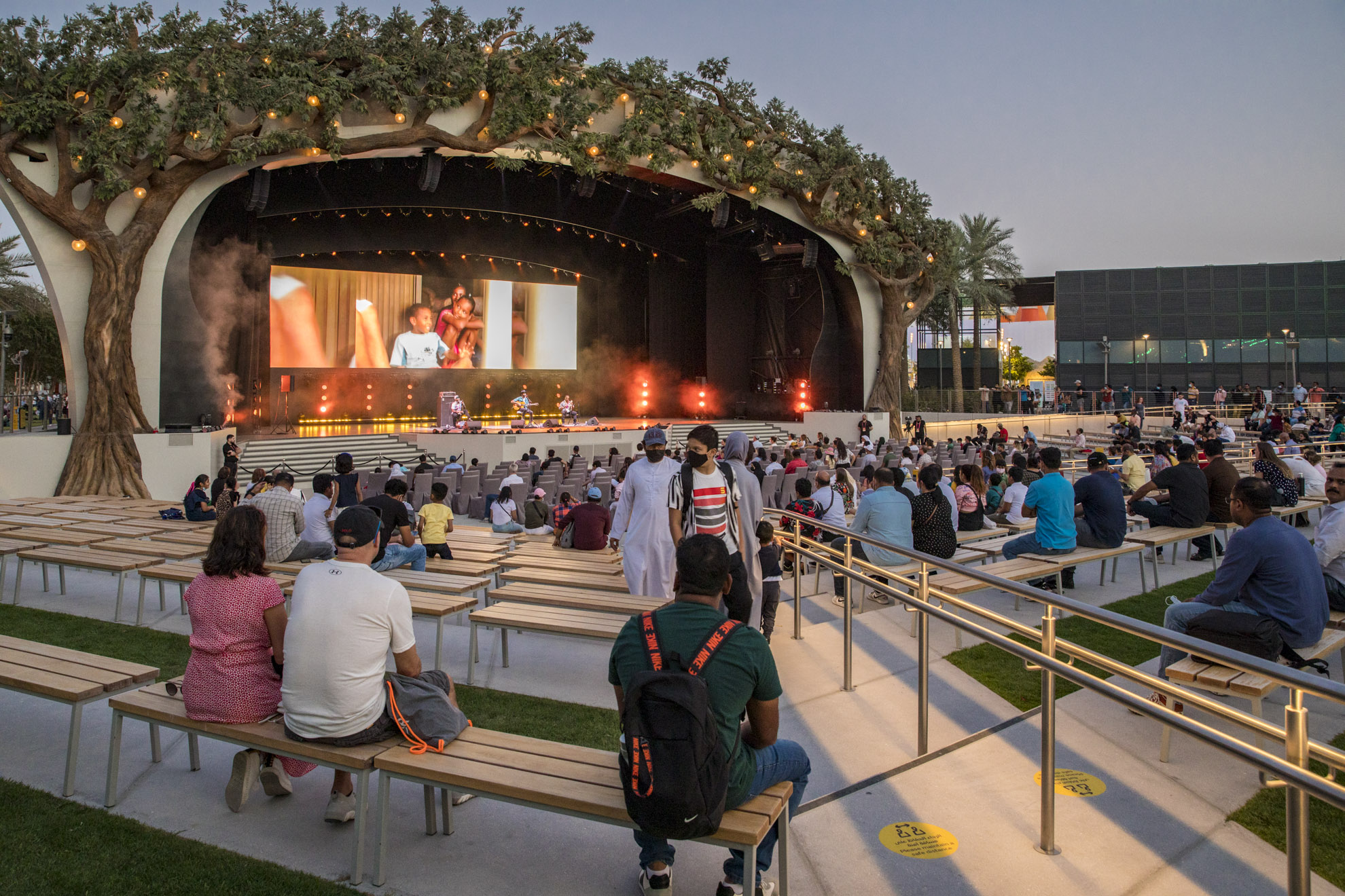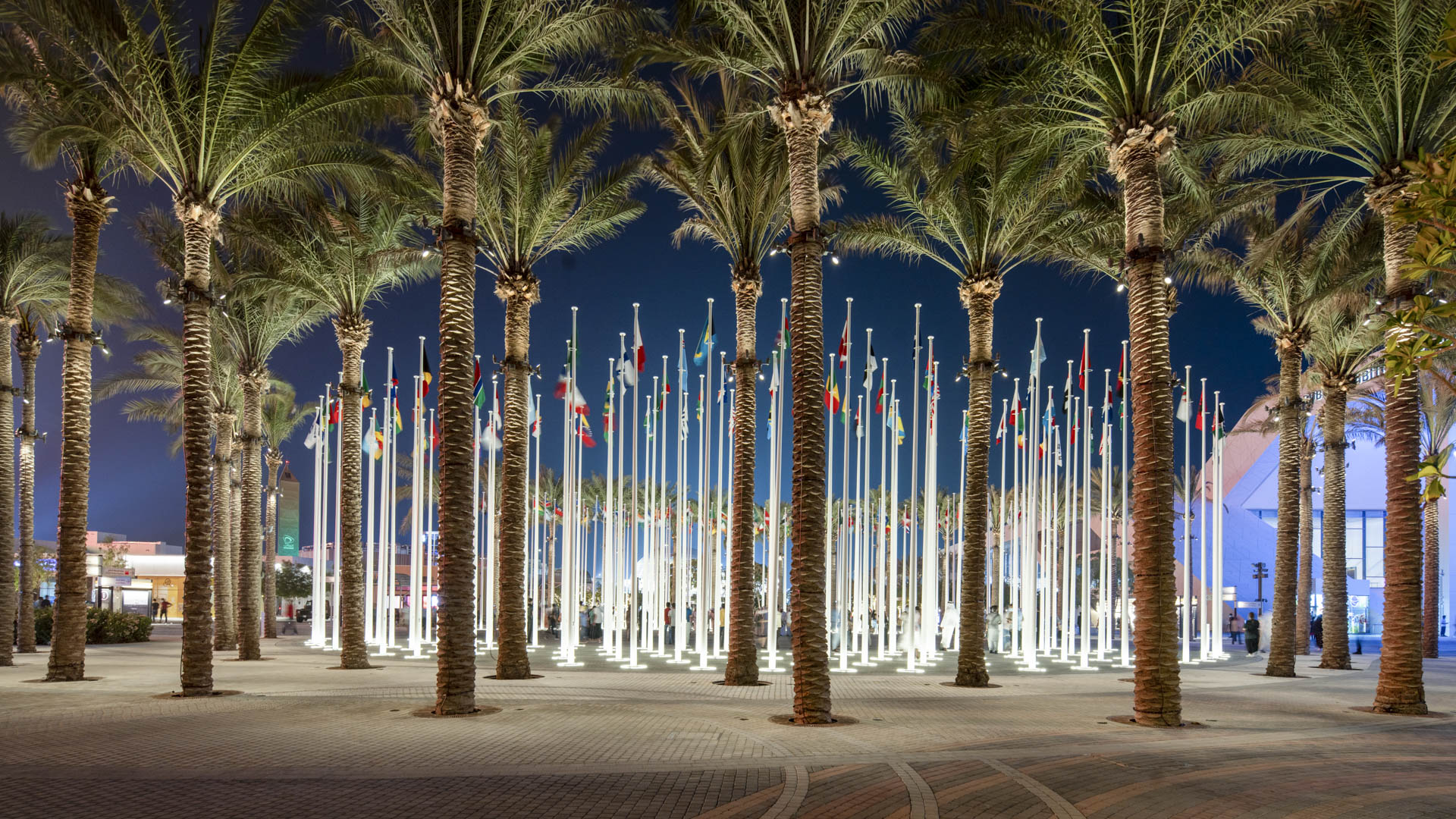 Expo visitors are welcomed with a dramatic progression of experiences upon arrival from the metro station, commencing with a broad Welcome Plaza, which narrows to a central, tree-lined promenade leading to Al Wasl Plaza.