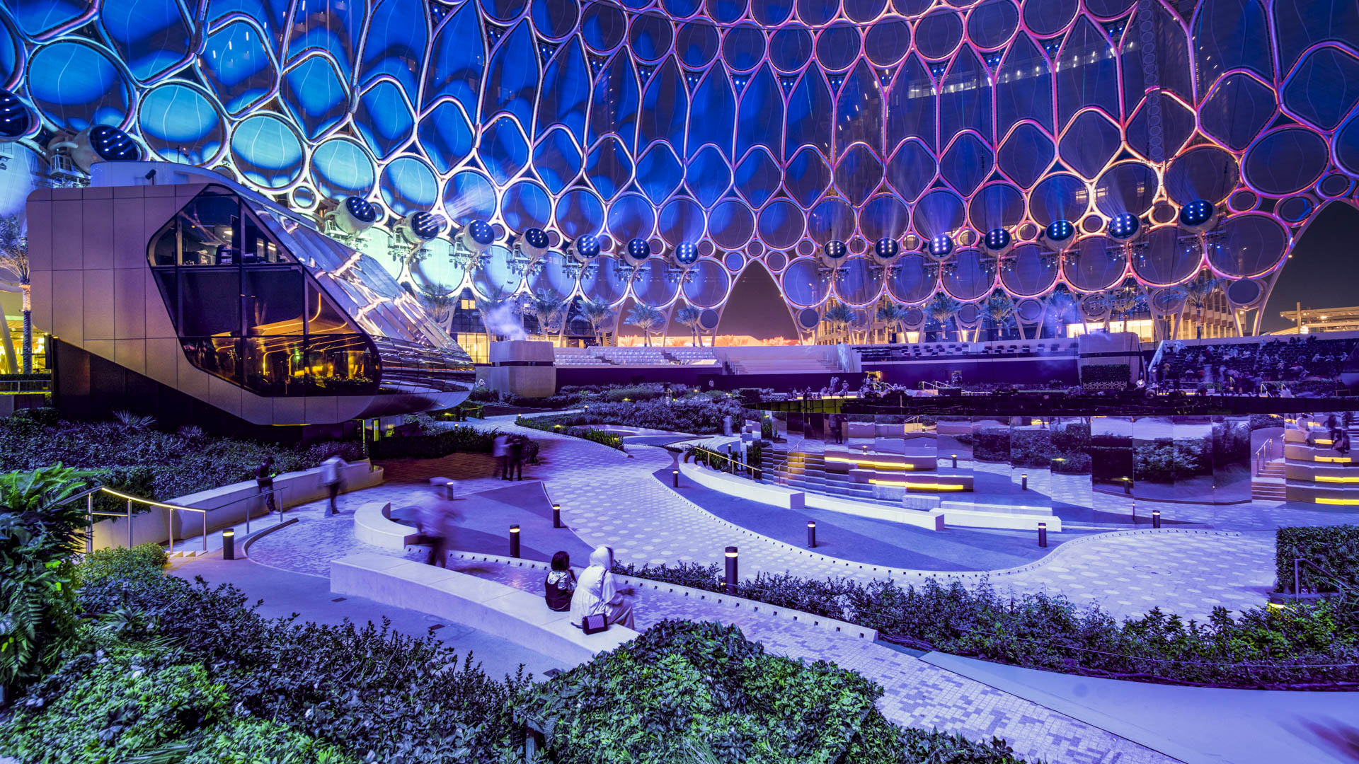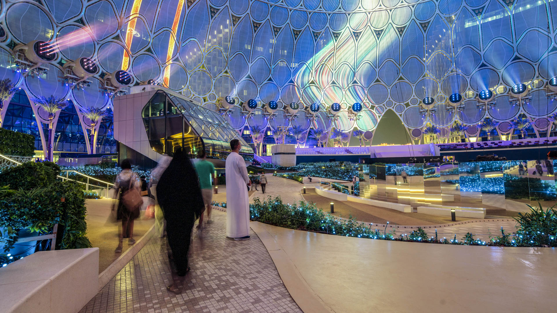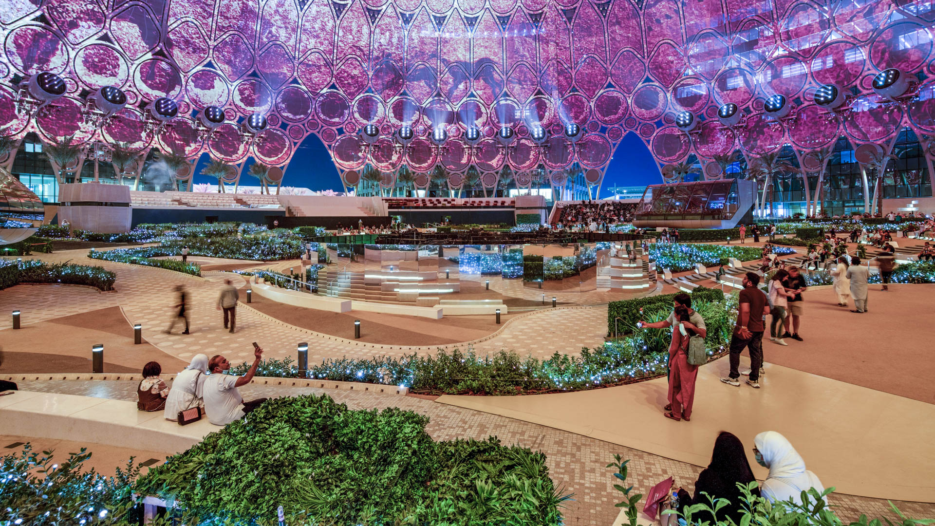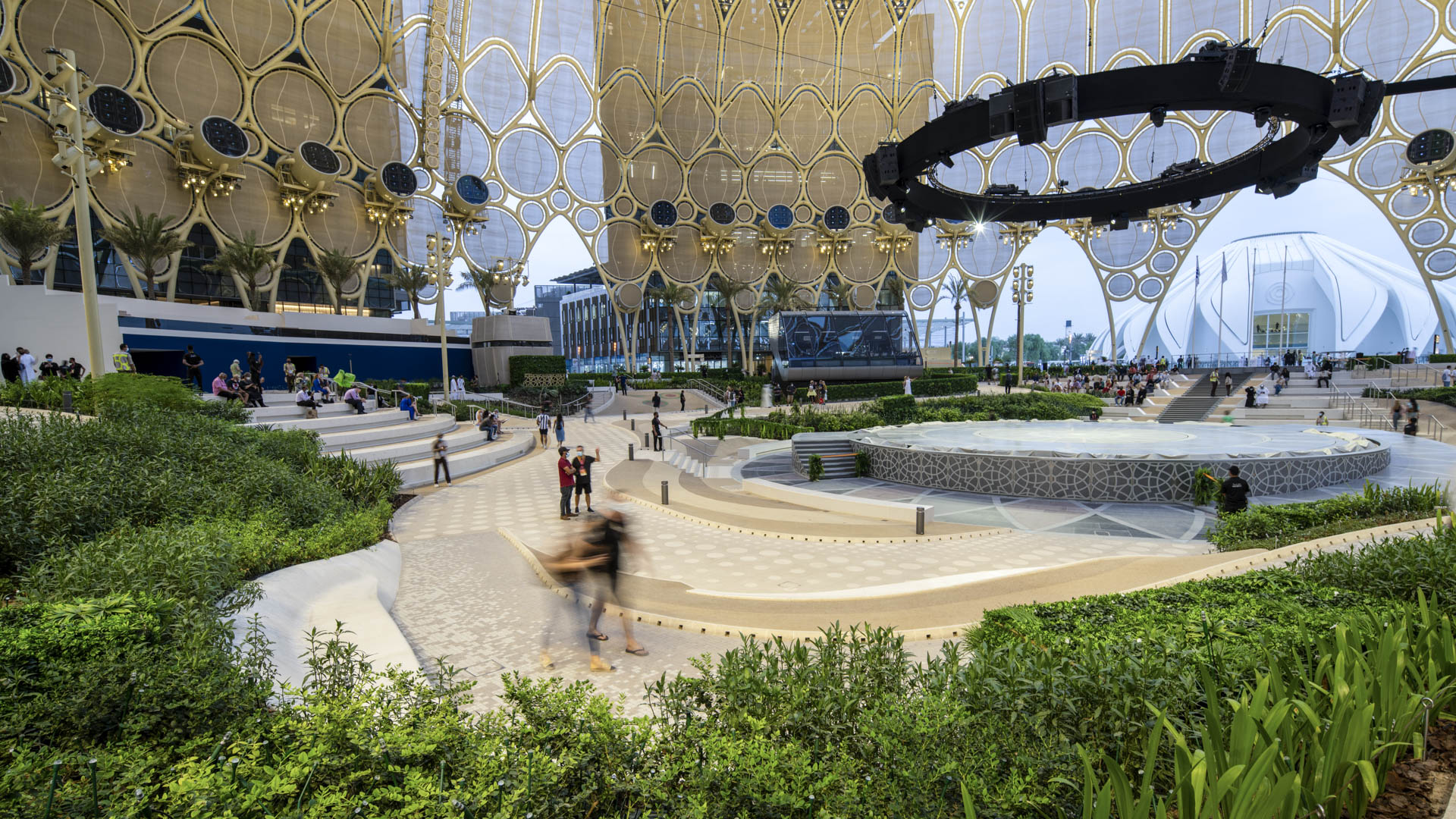 Al Wasl Plaza, where ground-scape and structure merge almost seamlessly, serves as the spiritual and actual center of the expo site. Here visitors experience the magic of this extraordinary indoor-outdoor, fabric-clad palace for projected light.