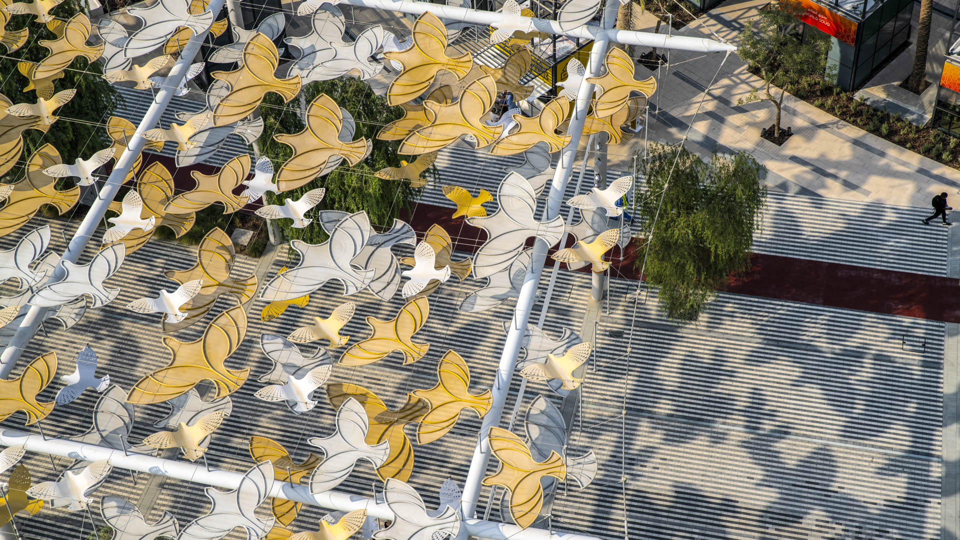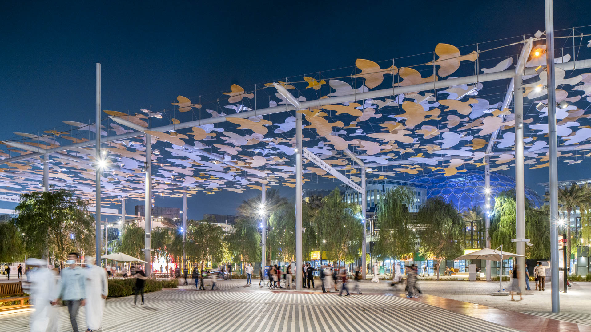 SWA’s design of The Loop, a dramatic shaded pedestrian promenade, encircles the site, allowing visitors to access Expo’s three districts. Overhead, SWA’s dazzling 10-meter-high shade structure is composed of suspended forms in the shape of birds, resulting in fantastic shadows on the boldly striped pavement below. The Loop is lined with Ghaf trees, the national tree of UAE.