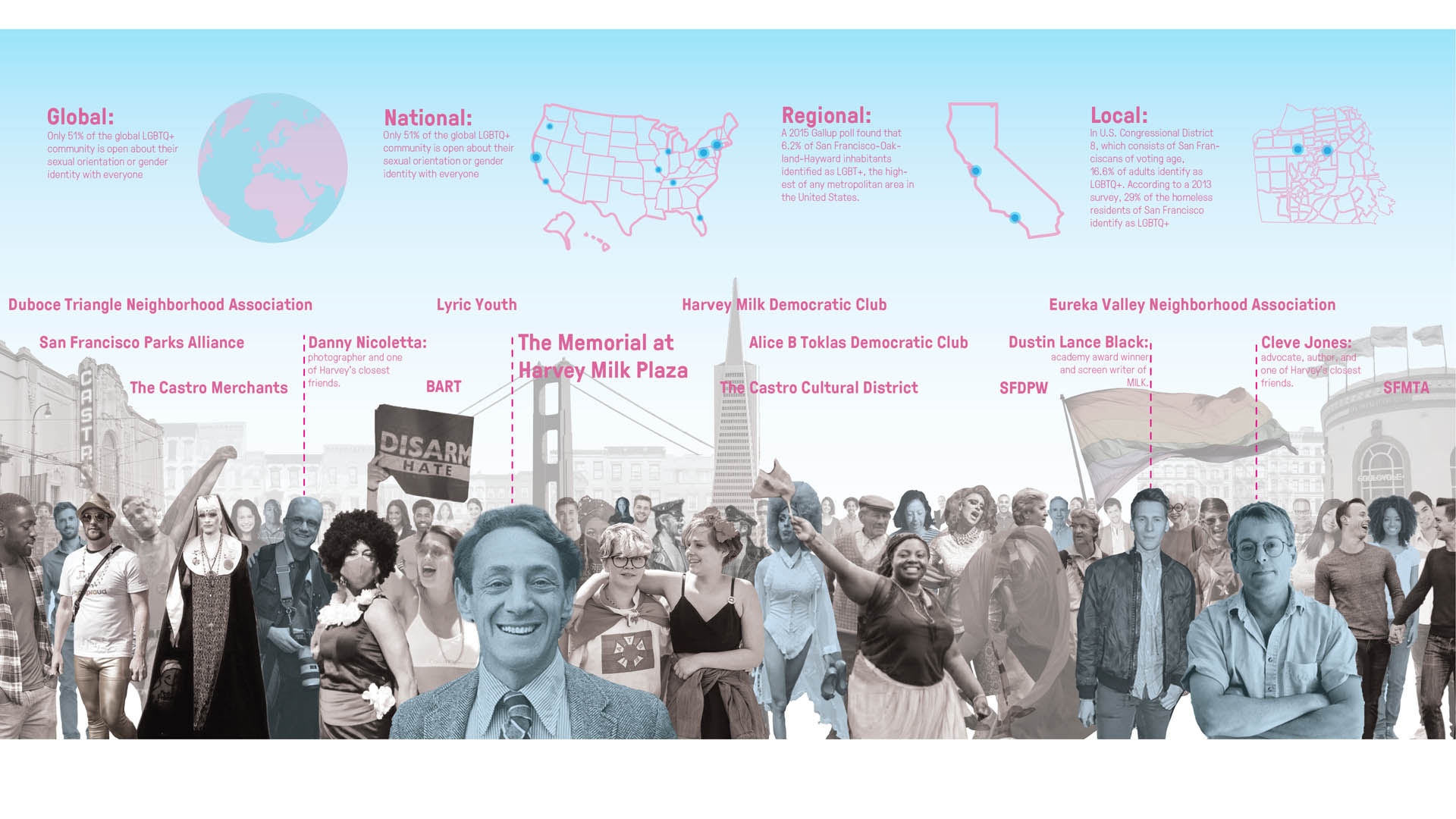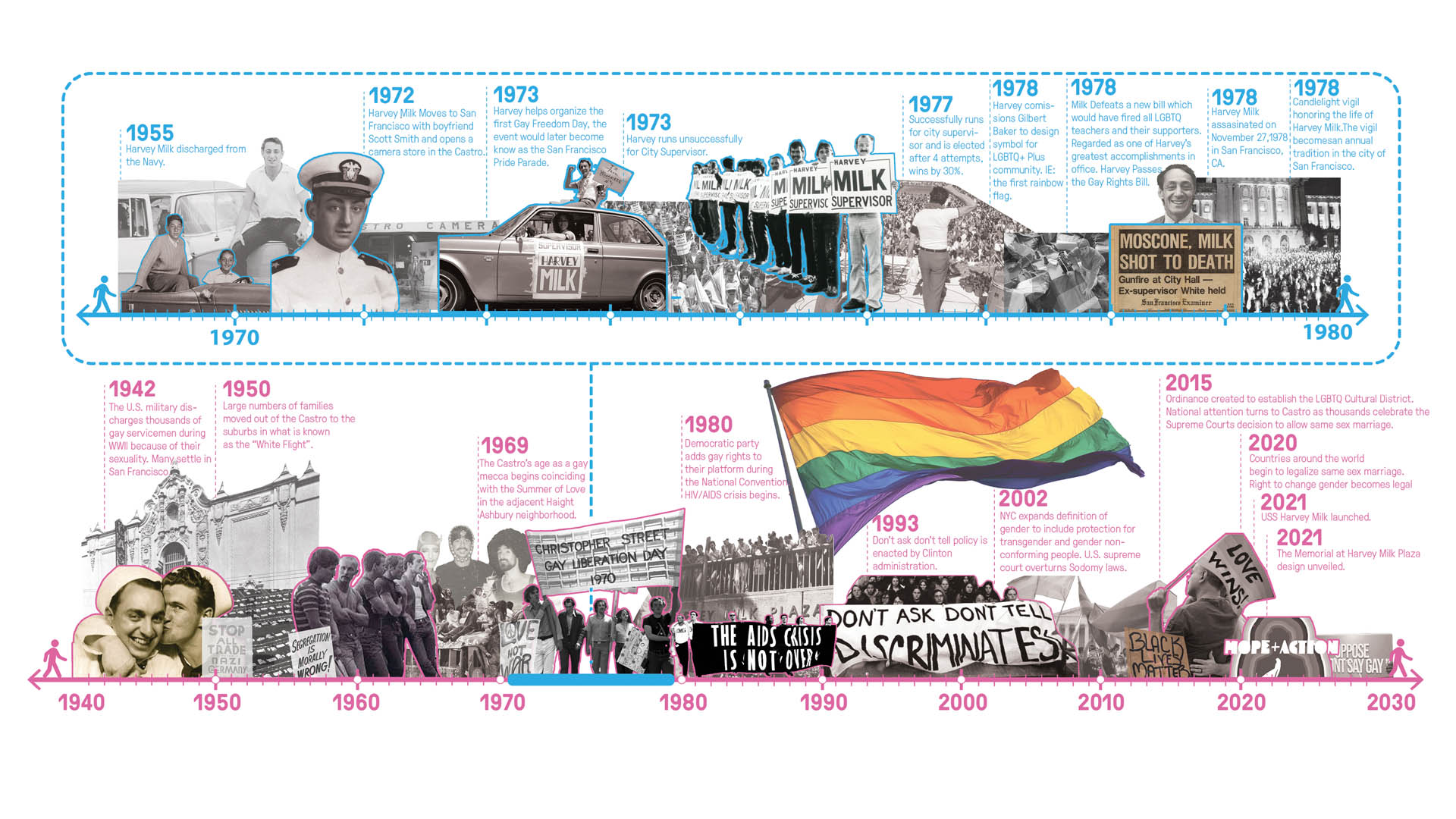 Milk was assassinated in 1978 along with San Francisco Mayor George Moscone. The plaza bearing his name lies at the prominent intersection of Market and Castro Streets, in the heart of San Francisco’s historically gay district. Since the 1960s, the Castro District has been the center for LGBTQ+ activism and culture, with the plaza acting as a gathering place from the days of the gay liberation front to the ongoing struggles of today. Since his assassination, the LGBTQ+ community has sought to celebrate the legacy of Harvey Milk, but until now there has been widespread no consensus on what that should look like. With a groundswell of community support the Memorial at Harvey Milk Plaza is moving closer to reality, with the plan on track to be shovel-ready by Summer 2023.