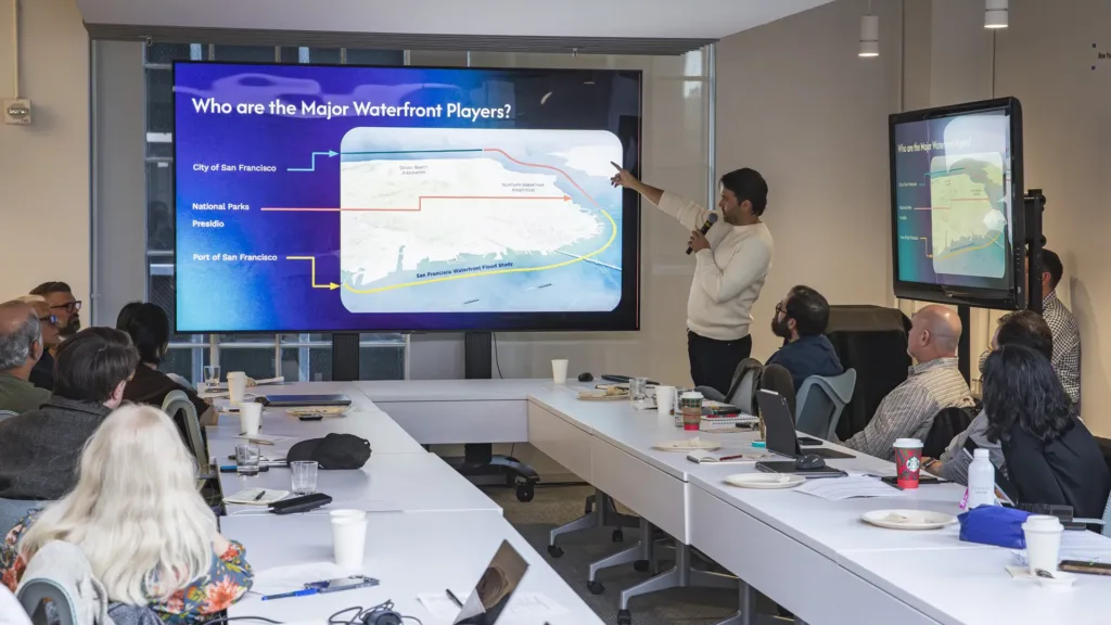 Breakout sessions surfaced shared priorities around project delivery and firm culture, including the need for clearer benchmarks for climate action, more structured avenues for design and research exchange between studios, and coordinated strategies for community engagement around water and fire risk. The meeting closed with a review of ongoing initiatives before the group reconvened informally for dinner.