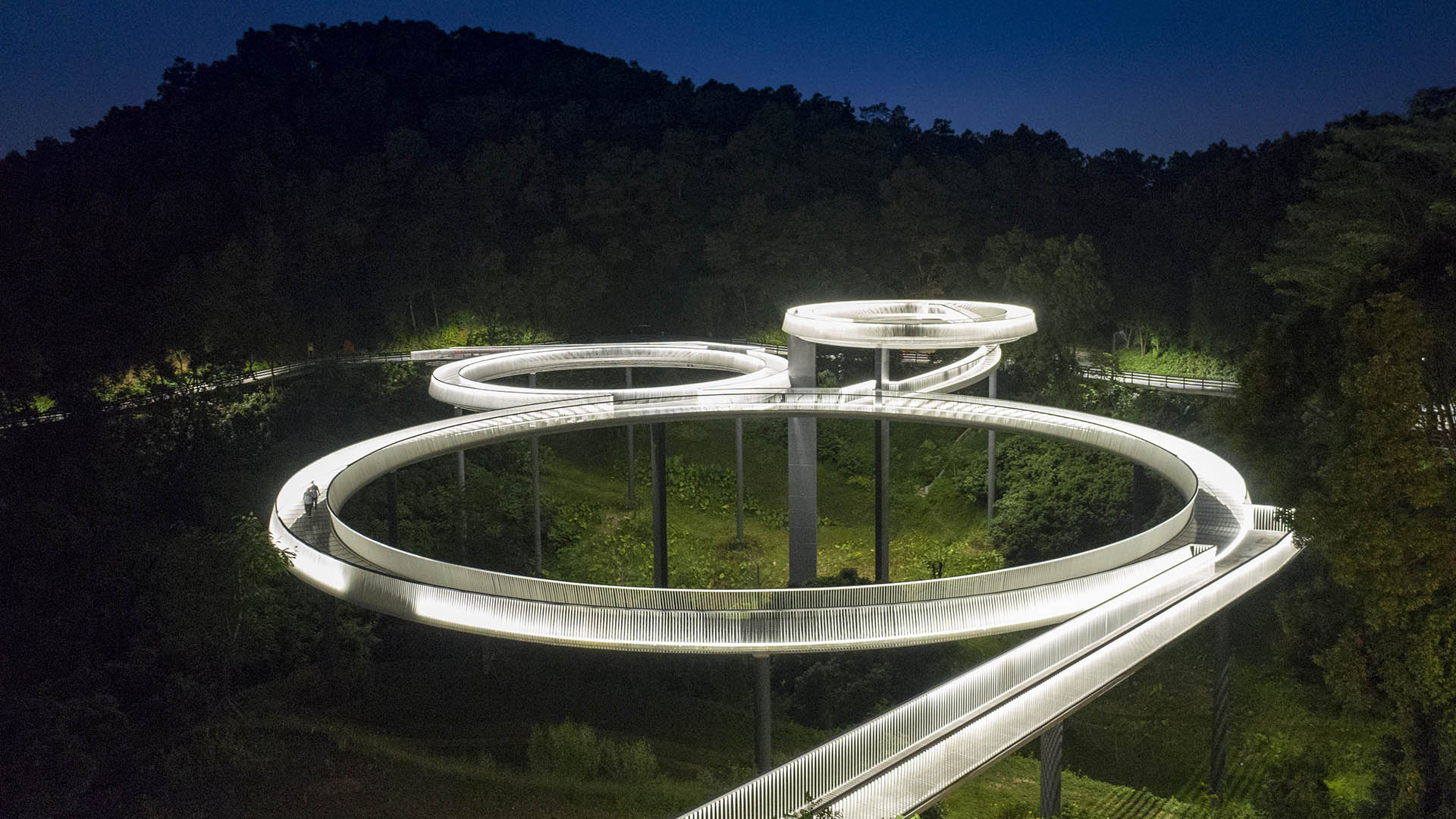 Guangming Trail represents a significant investment and upgrade in the historically agricultural outskirts of Shenzhen. We were originally tasked with expanding and improving a regional jogging and biking trail through a rugged landscape overlooking the city that was historically a lychee farm. Our client was ambitious, and we saw the opportunity to create an iconic destination for locals and tourists that would support healthy living in this increasingly urbanized part of China. It is an unusual project, and what may have garnered the most attention is the introduction of its three bespoke pedestrian bridges, which literally elevate the trail to offer striking views and establish local landmarks. I was involved in siting and conceptualizing all three bridge forms, and then partnered with the project engineer to execute them technically. The Floating Bridge, with its glowing rings powered by integrated solar panels, has attracted international media attention, but the Discovery Bridge has become the go-to destination for visitors to take “selfie” photos. And the Wind Song Bridge is China’s first stress-ribbon pedestrian structure. It drapes across a valley, and sways and “sings” with the wind so that visitors have a visceral (and sonic) experience of height and motion.